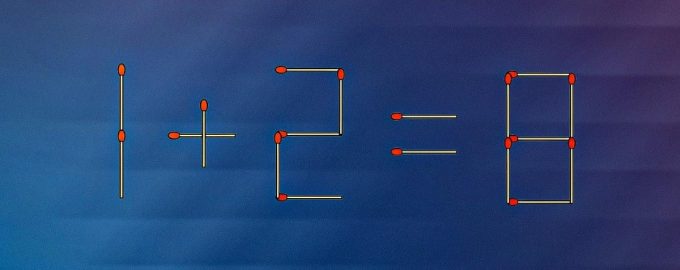 Íme tehát egy hibás egyenlet: 1+2=8. Ez 18 gyufából áll. Csak egy gyufát kell áthelyezned egy másik helyre, és az egyenlet helyes lesz.